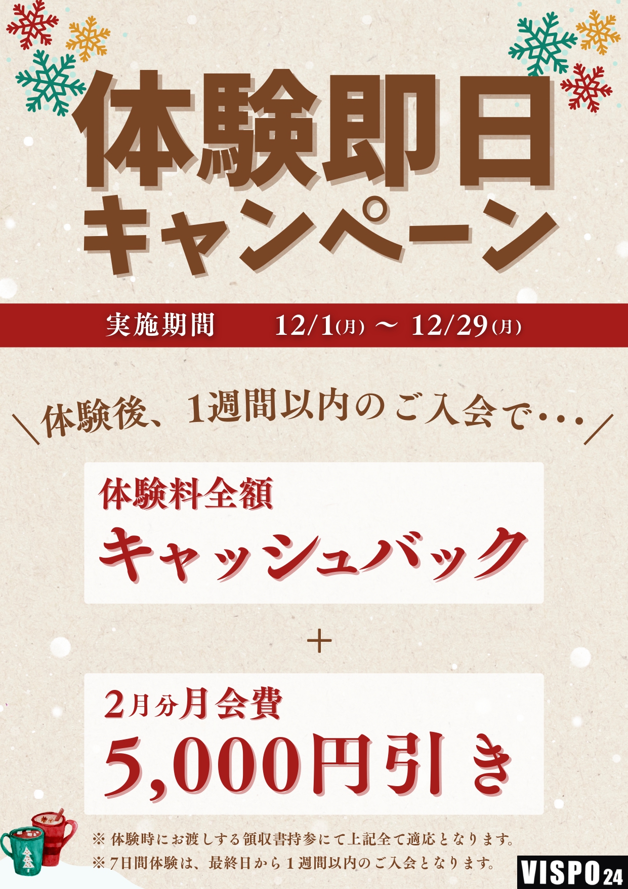 体験料全額キャッシュバック & 2月分月会費5,000円引き!!!