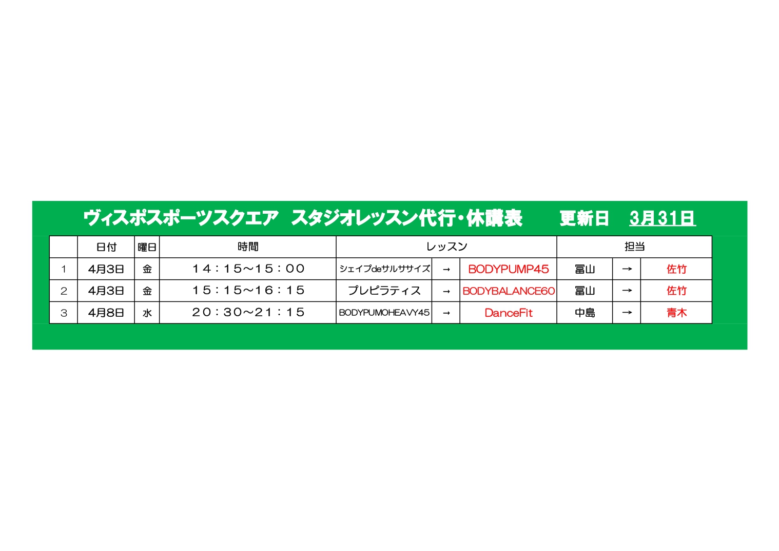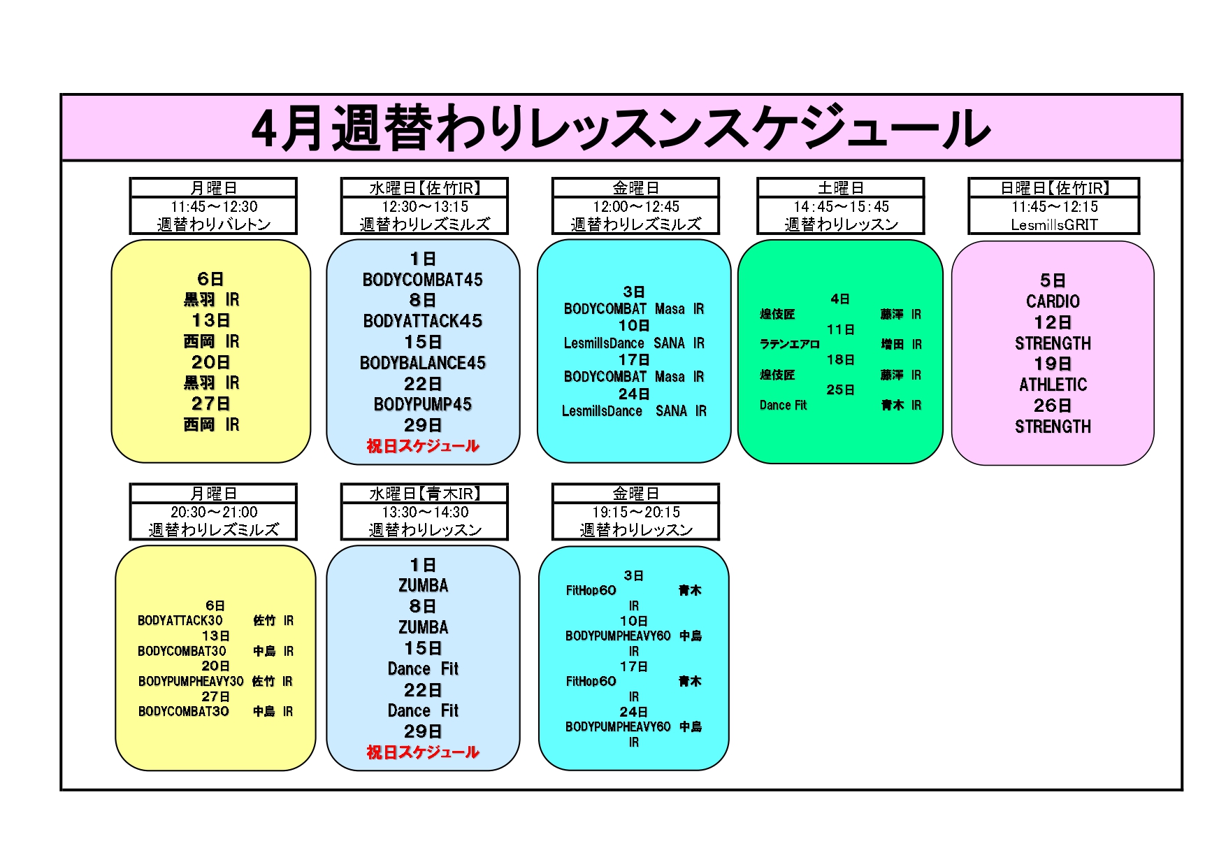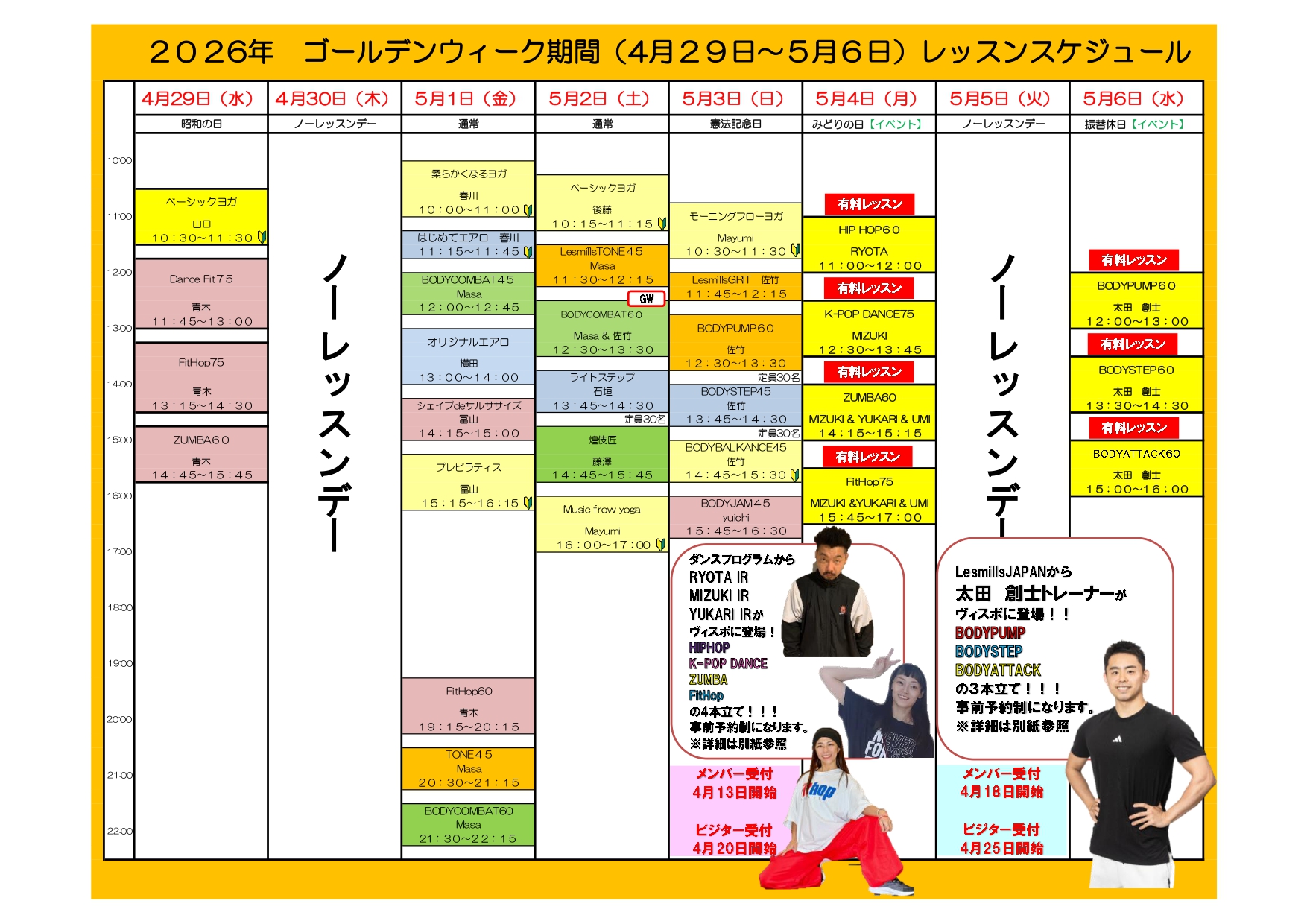 こんにちは!! 4月レッスンスケジュール 4月週替わりレッスンスケジュール 代行案内 GWレッスンスケジュール 5/4(月)イベントレッスン詳細 5/6(水)イベントレッスン詳細 になります! 詳細は以下の画像をご確認下さい。
