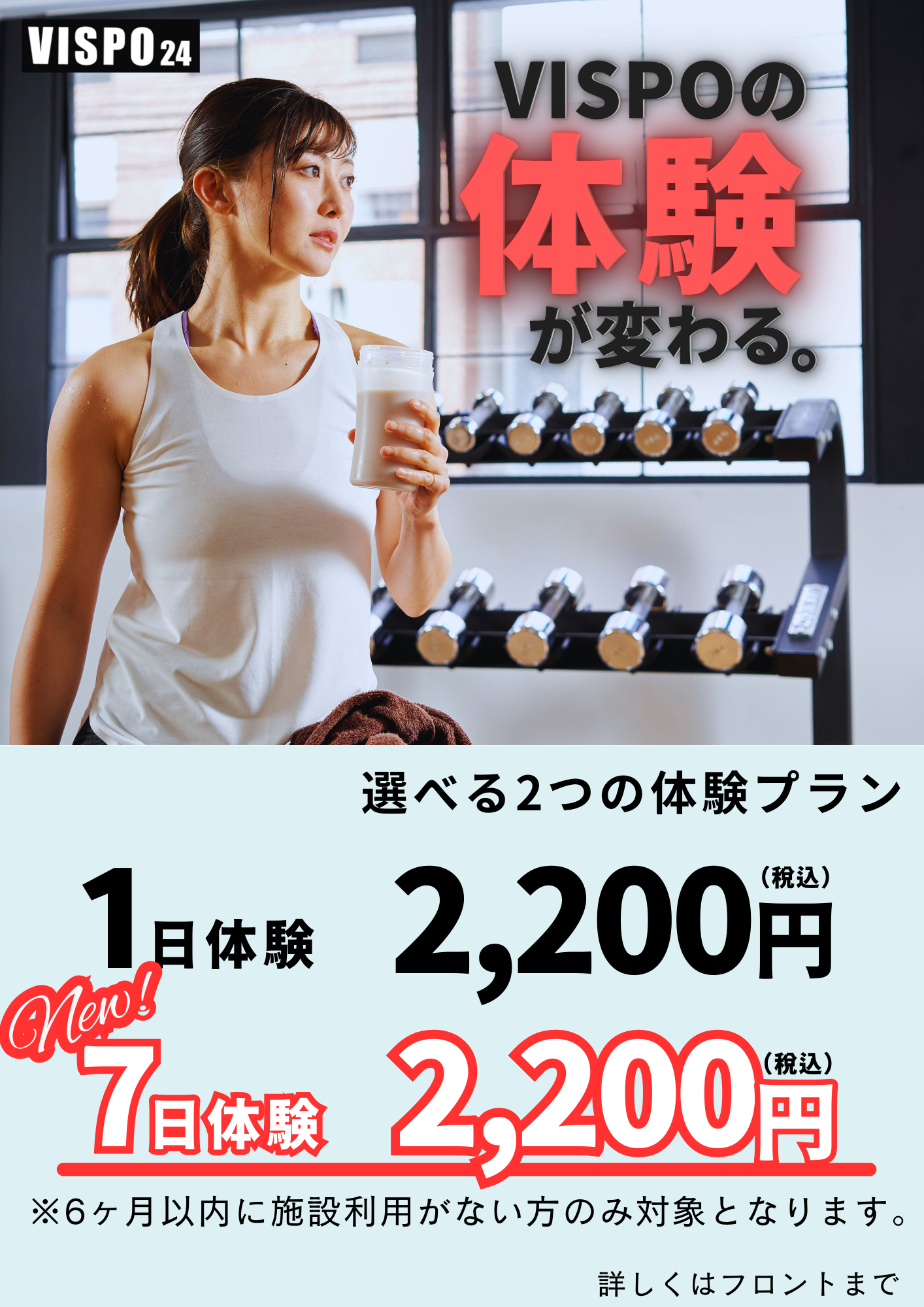 入会が不安な方もまずはVISPOの1日体験で施設内、マシン、レッスン、スタッフの対応などをまずはご体験ください!